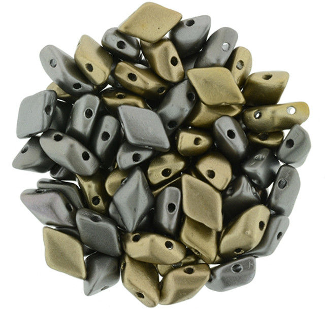 GemDuo, the newest addition from Matubo Beads is a diamond shaped bead with a flat bottom and two parallel holes. The GemDuos have a gently beveled top with a slightly raised center ridge.