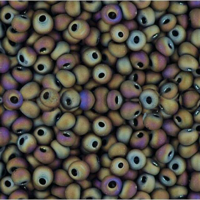 Drop beads (DP) are seed beads shaped like a tiny teardrop with the hole at the narrow top end of the bead. Miyuki drop beads measure 3mm x 3.4mm with a hole size of .65mm. Toho drop beads are 3mm x 3mm. Both can be used in patterns calling for small drop beads or 'fringe' beads (because they are fabulous at the bottom of beaded fringe). If your project calls for more than one color, you might want to pay attention to whether a color is made by Miyuki or Toho as the Tohos are slightly smaller. Both come packaged 9 grams to a bag or tube and contain approximately 175-180 beads.