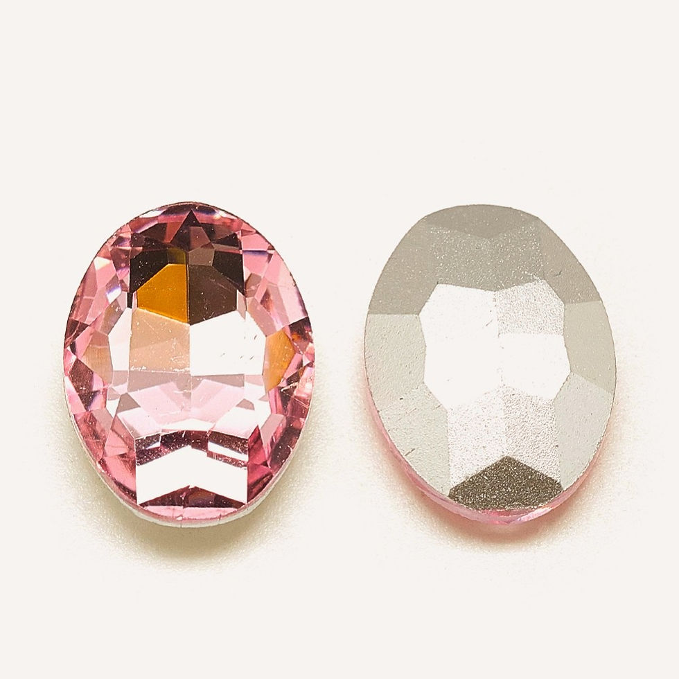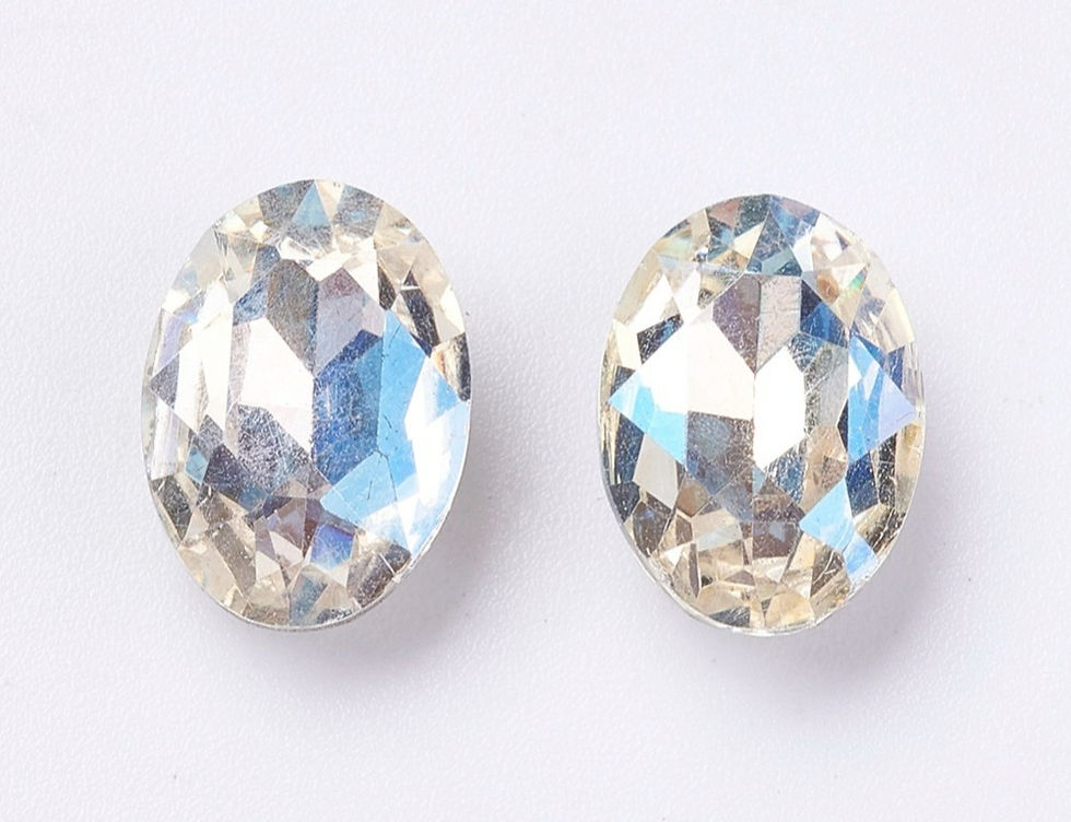 We carry machine-cut oval shaped crystals without holes or settings, and some sizes with settings. Both are designed to be bezeled with wire or seed beads to create gorgeous projects. We currently have them in three sizes: 20X30mm, 13X18mm, and 10X14mm. Coming soon in 18X25mm. The larger sizes make stunning focal pieces in necklaces and the smaller are great for many jewelry designs especially earrings.